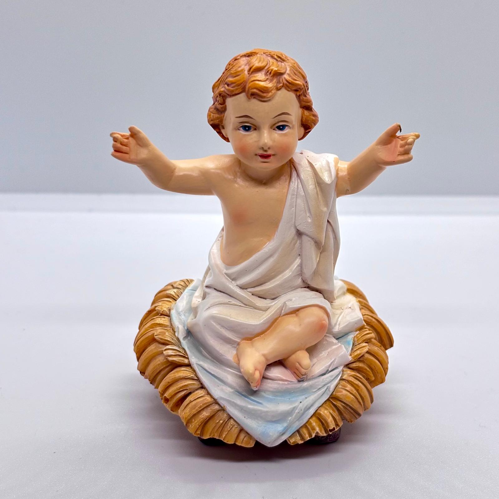 Gesù Bambino, realizzata in resina e caratterizzata da un’espressione dolce e accogliente. La figura, con le braccia aperte in gesto di benedizione, trasmette un forte senso di amore, pace e tenerezza, richiamando il significato più profondo della Natività.