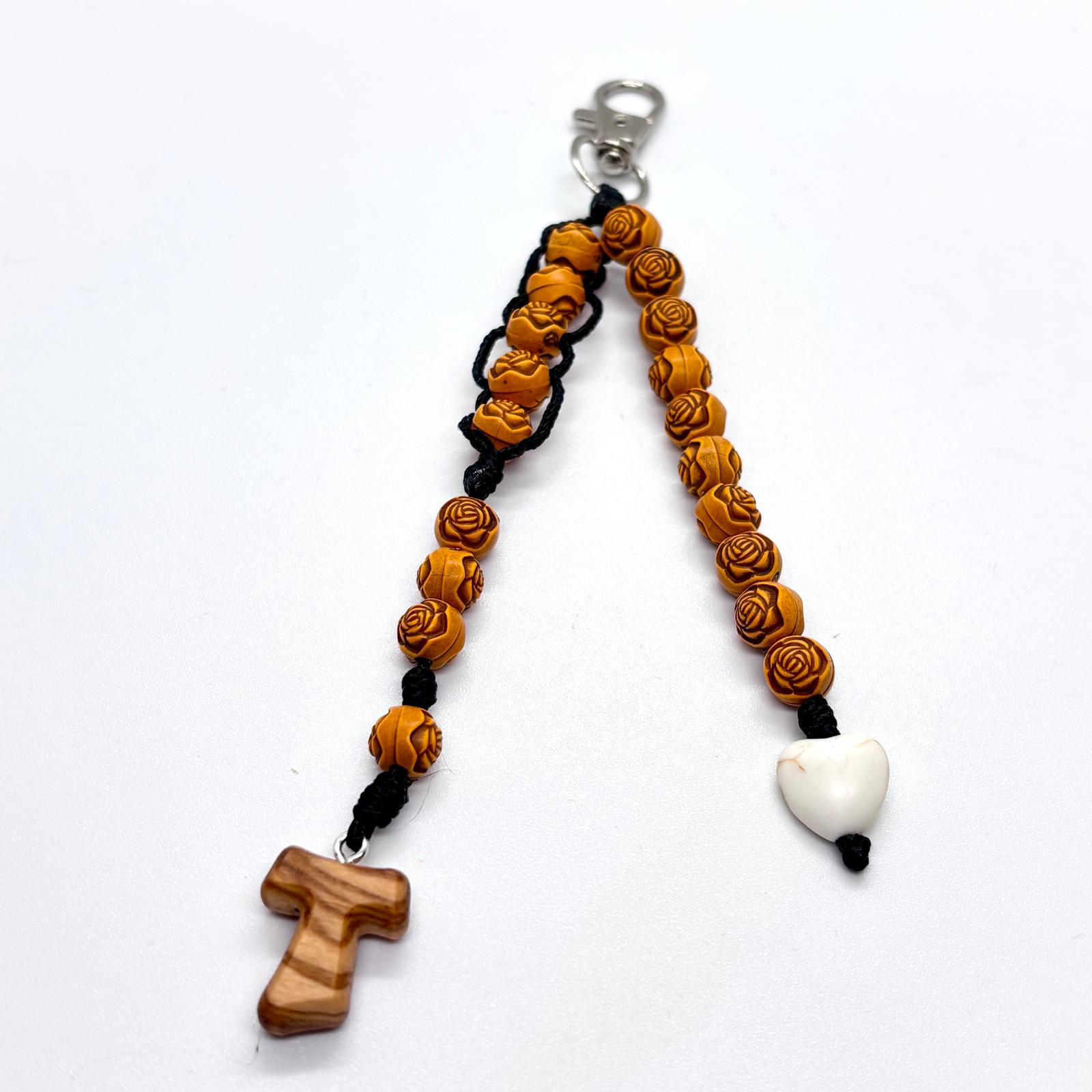 Dotato di moschettone, può essere facilmente agganciato a borse, zaini o portachiavi, rendendolo ideale per la preghiera quotidiana anche fuori casa. Il ciondolo finale completa il rosario con semplicità ed eleganza.