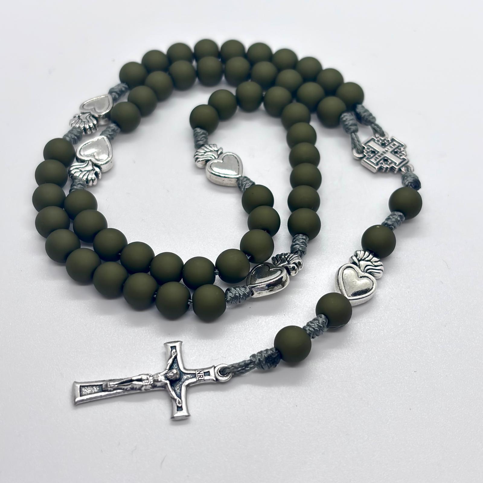 Il rosario è impreziosito da cuori in metallo lungo la corona, simbolo di amore, fede e devozione, e da una crociera a forma di croce di Gerusalemme, segno di protezione e spiritualità profonda.
