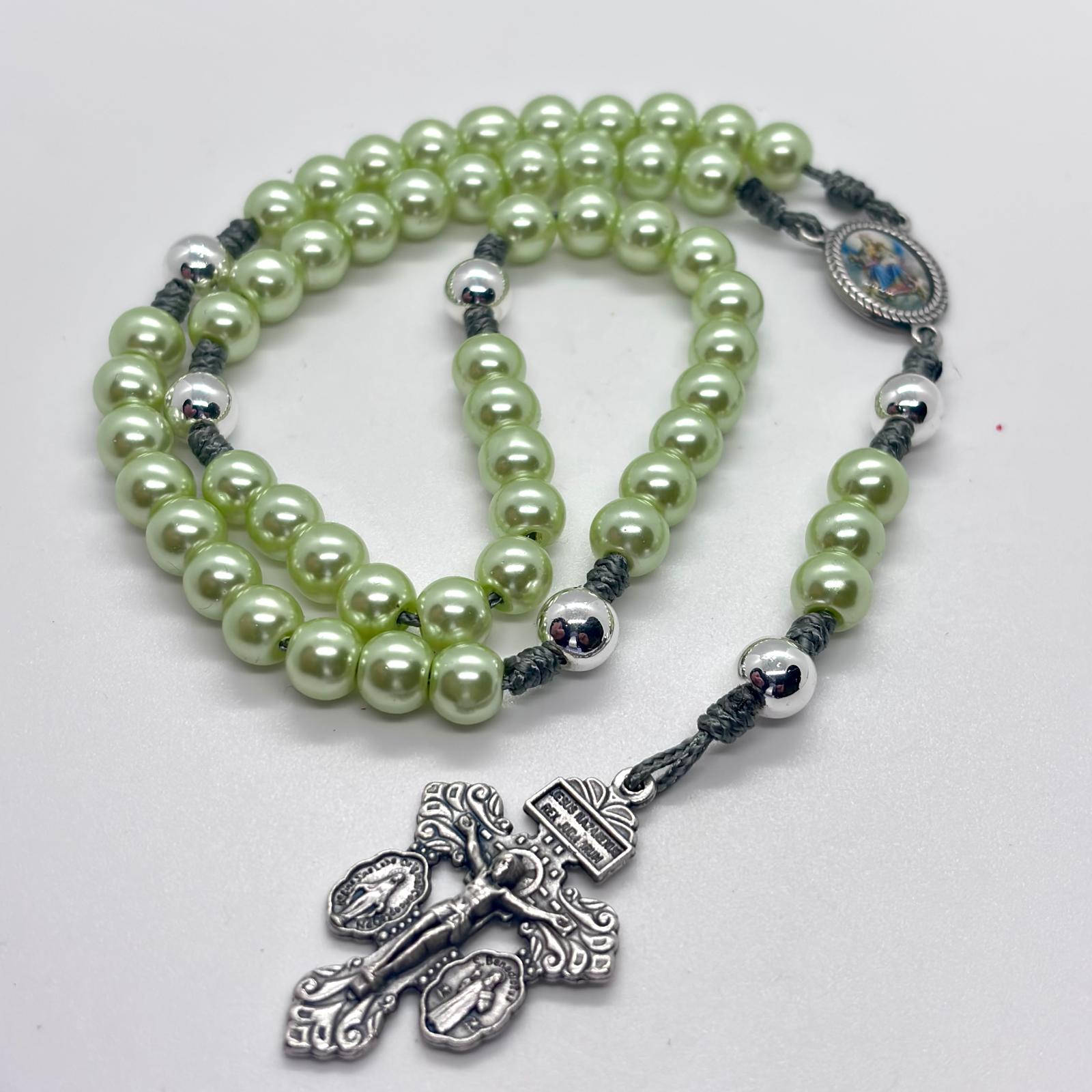 Rosario realizzato a mano con cura artigianale, impreziosito da grani in vetro verde perla, luminosi e raffinati, che donano eleganza e delicatezza alla preghiera.