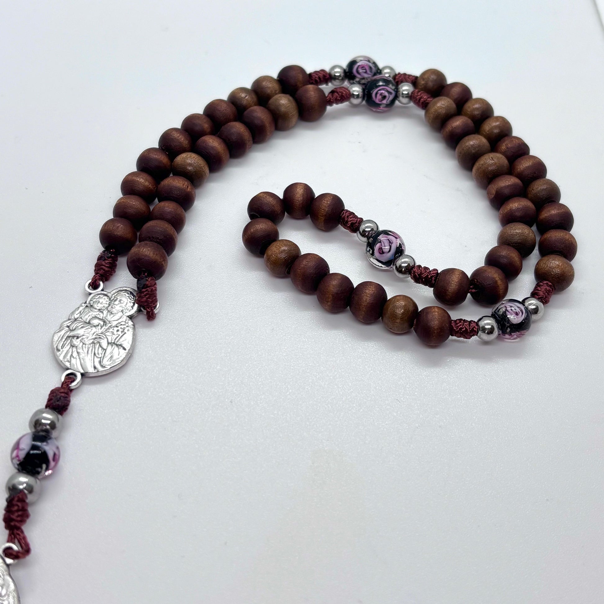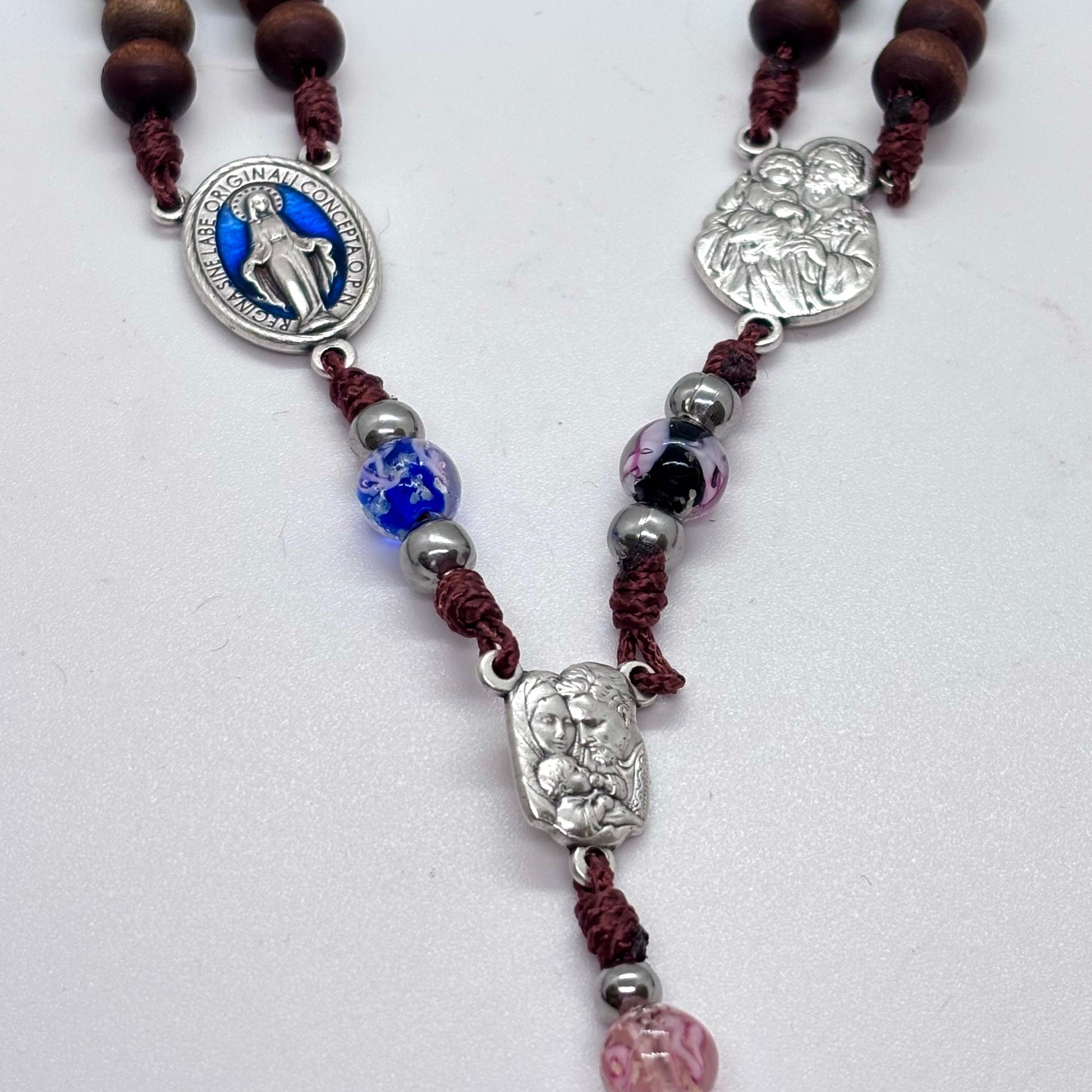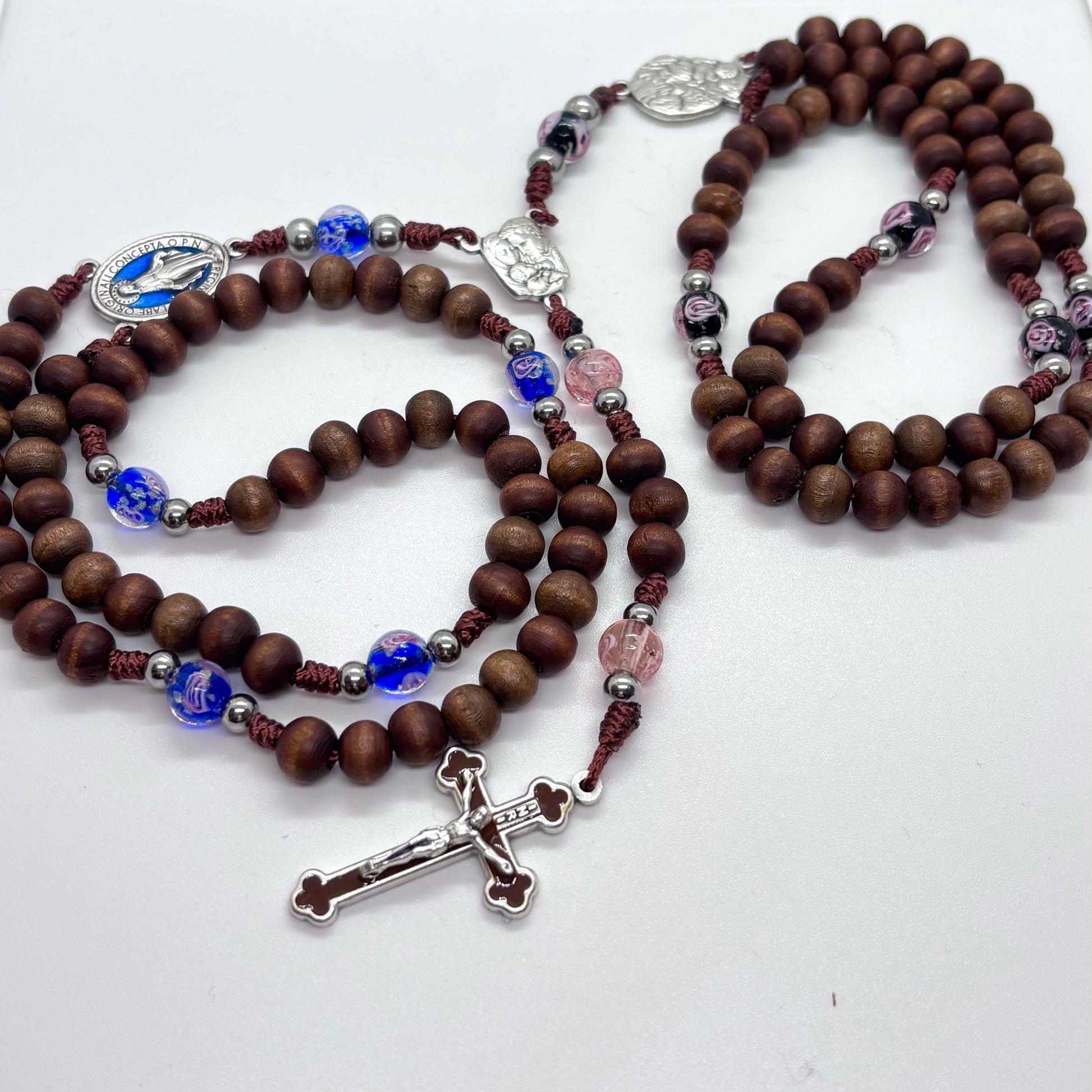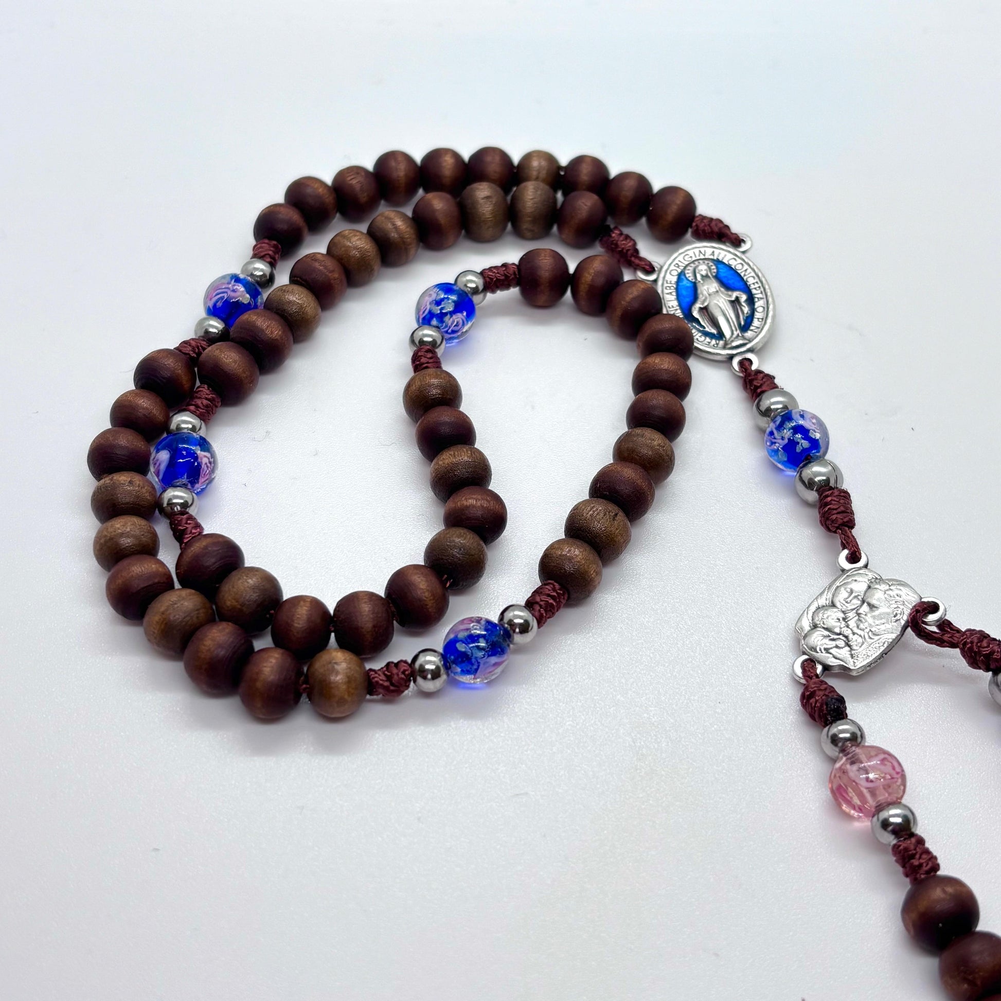 Questo elegante rosario è realizzato interamente a mano a Firenze, simbolo di fede, amore e unione eterna. Le perle in legno naturale si alternano a delicate perle in vetro colorato nelle tonalità del blu e del rosa, rappresentando l’unione armoniosa tra sposi.