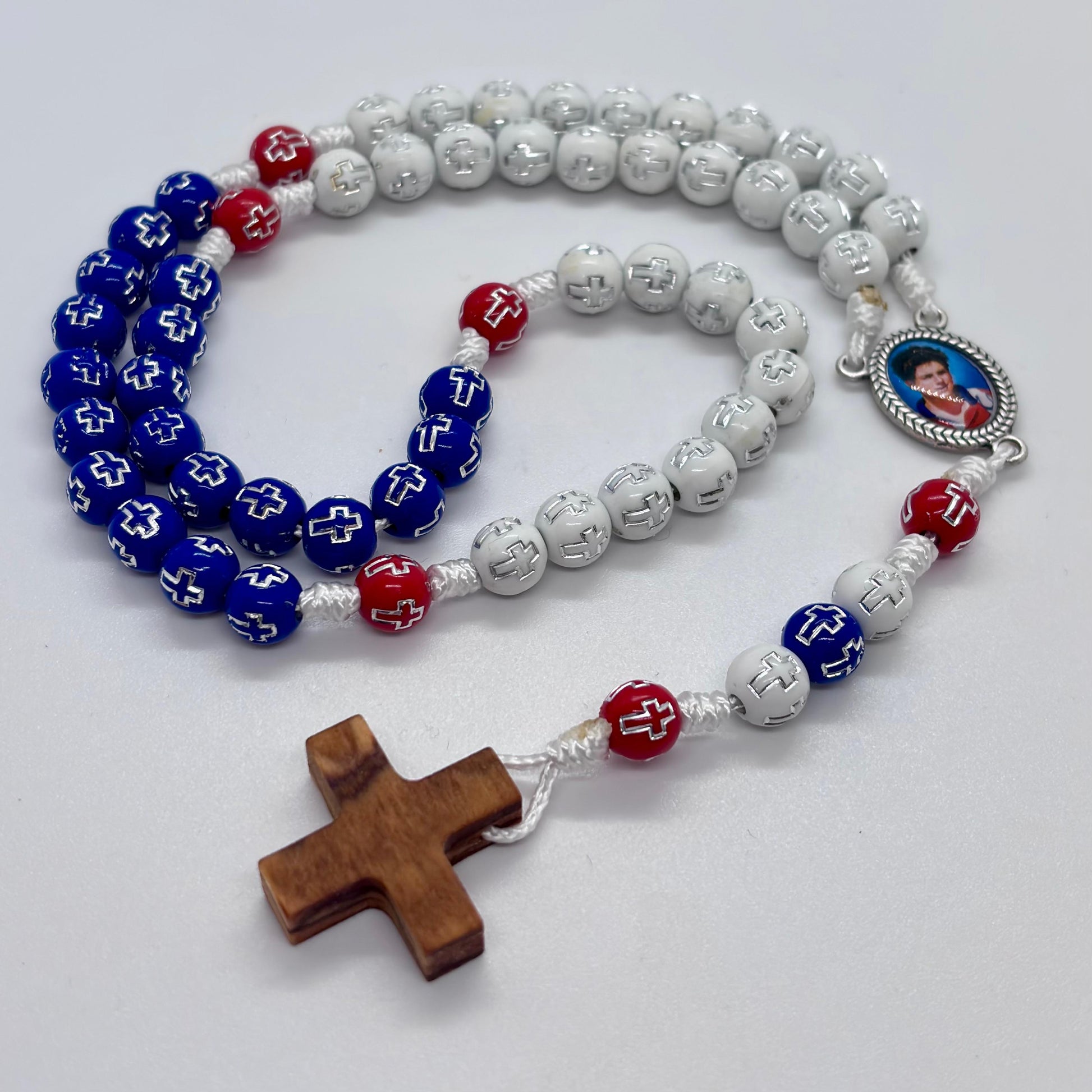Realizzato con perline colorate blu, bianche e rosse decorate con piccole croci, questo rosario unisce tradizione e vivacità.
