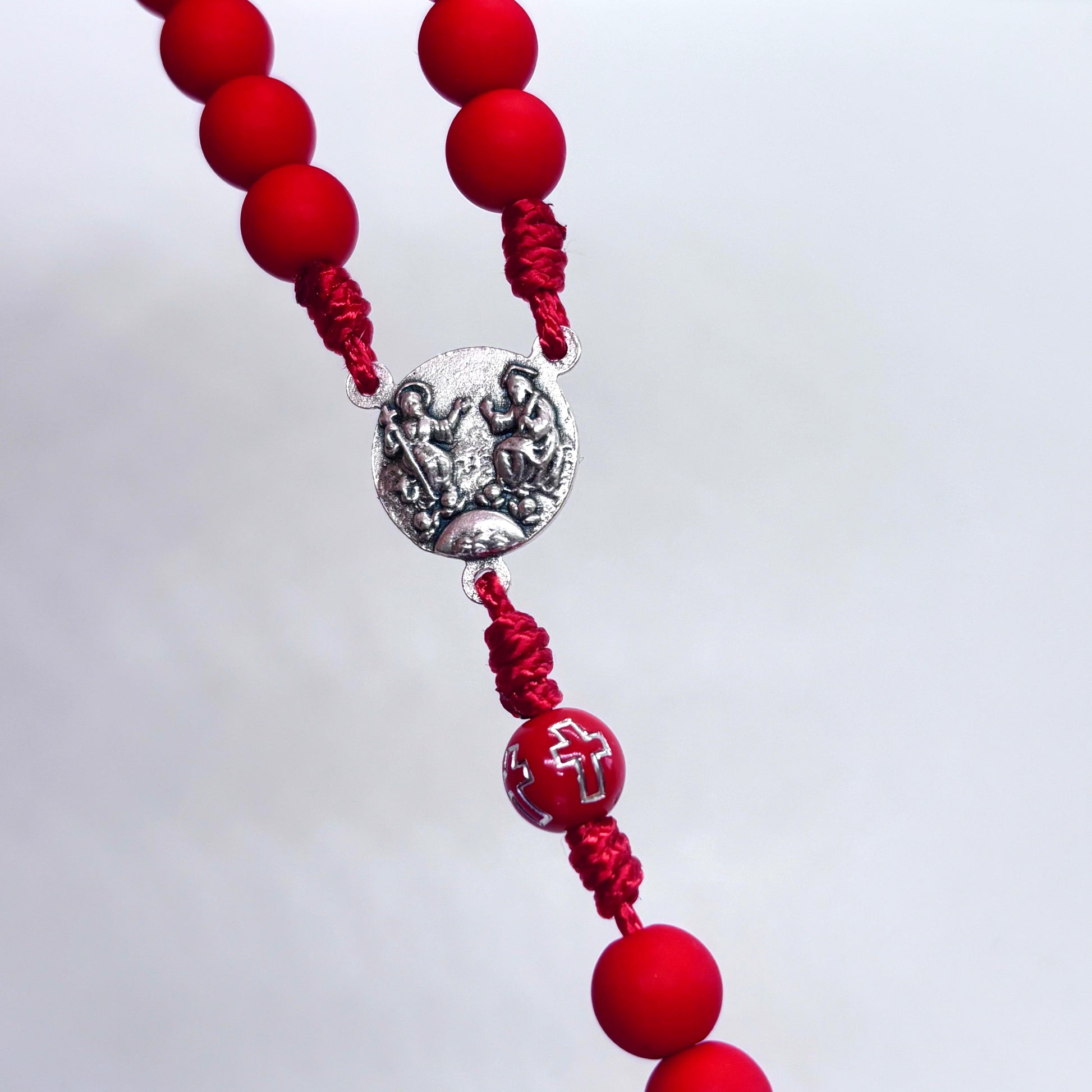 Cordone intrecciato a mano in resistente filo rosso, tono su tono con le perle, che rafforza il tema del fuoco dello Spirito.