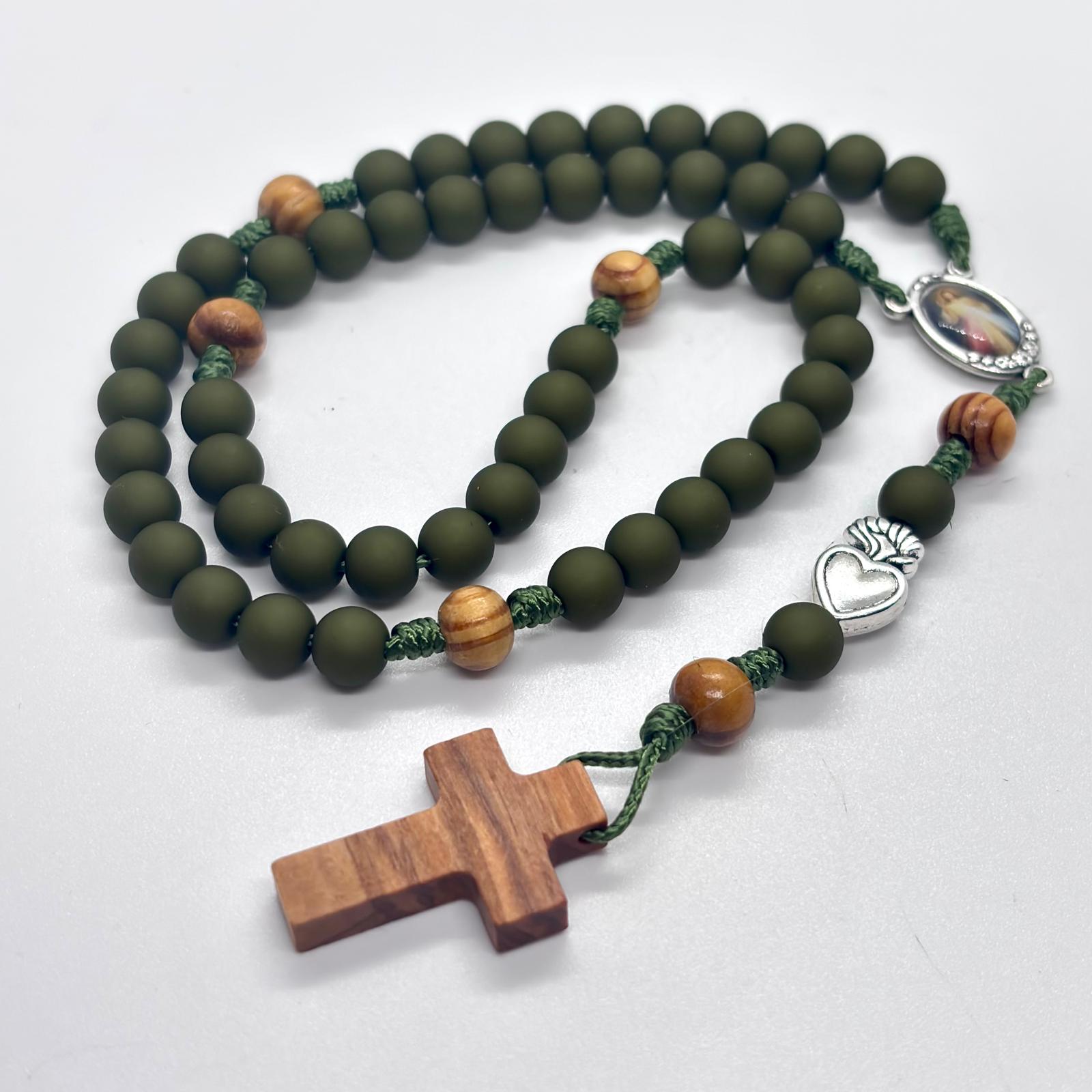 Il rosario è impreziosito da grani decorativi in tonalità legno che donano calore e naturalezza al design.
